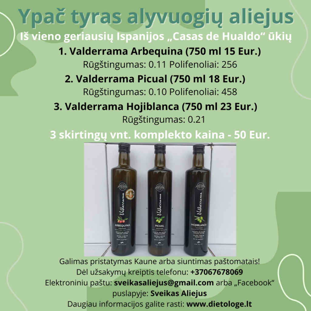 Siūlome pigiausiai rinkoje, ypač tyrą, alyvuogių aliejų su dideliu polifenolių kiekiu ir žemu rūgštingumu iš vieno geriausių Ispanijos „Casas De Hualdo“ ūkių. Trijų skirtingų alyvuogių rūšių aliejaus po 750 ml komplekto kaina 50,-eur. Galima įsigyti ir po 1 butelį kainos pateiktos žemiau.